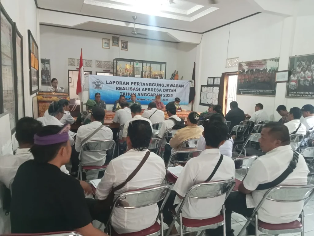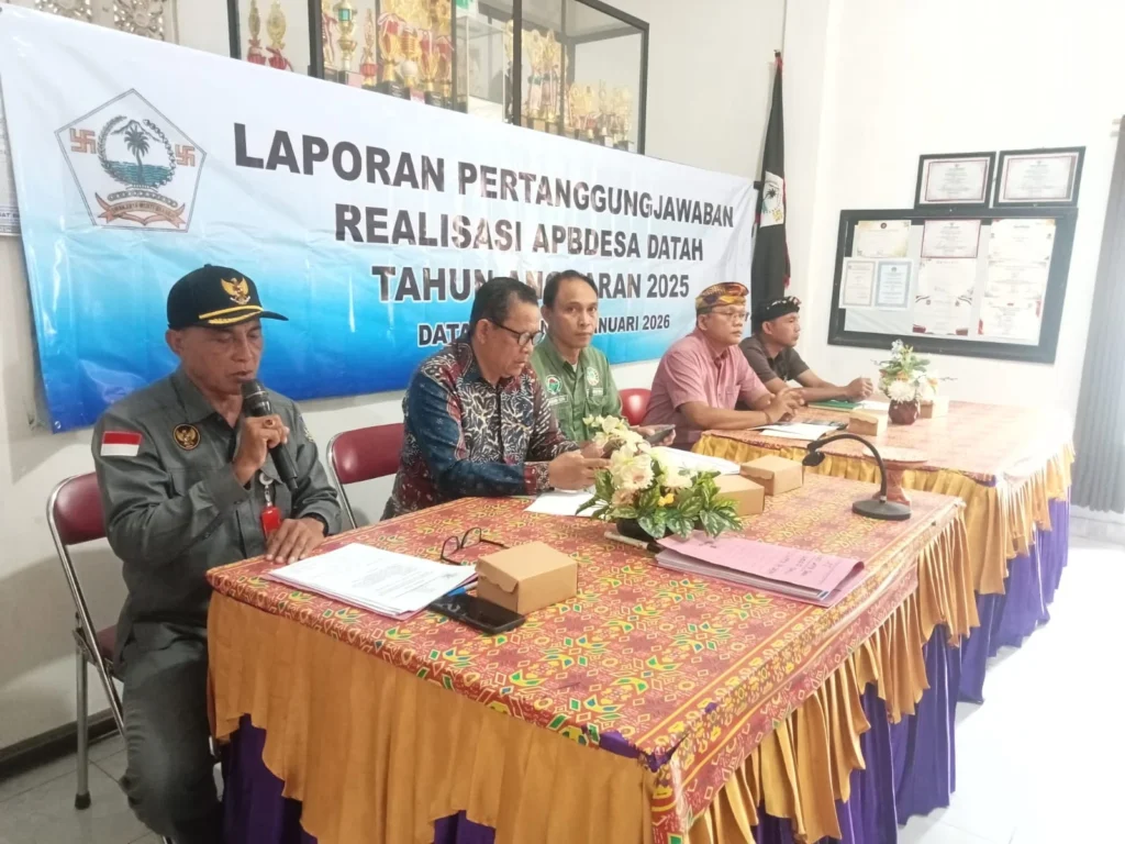 Pemerintah Desa Datah menyelenggarakan kegiatan Laporan Pertanggungjawaban Realisasi APBDesa Tahun Anggaran 2025 pada Senin, 26 Januari 2026 bertempat di Aula Kantor Perbekel Datah. Kegiatan ini menjadi bagian penting dari komitmen pemerintah desa dalam mewujudkan tata kelola pemerintahan yang transparan, akuntabel, dan partisipatif.