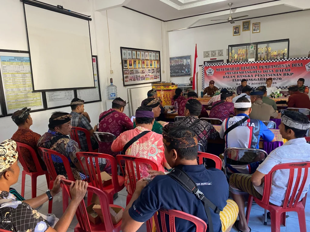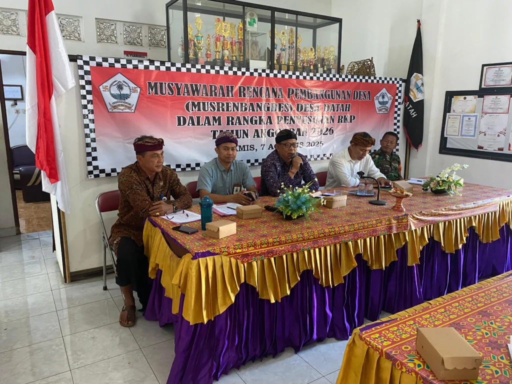 Musyawarah Perencanaan Pembangunan Desa (Musrenbangdes) yang digelar di Aula Kantor Perbekel Datah pada Kamis, 7 Agustus 2025, menjadi forum utama masyarakat dalam menyampaikan dan memutuskan usulan-usulan pembangunan yang akan menjadi prioritas pada tahun anggaran 2026. Fokus utama tahun ini difokuskan pada pembangunan infrastruktur jalan, khususnya berupa rabat beton di sejumlah ruas penting desa.